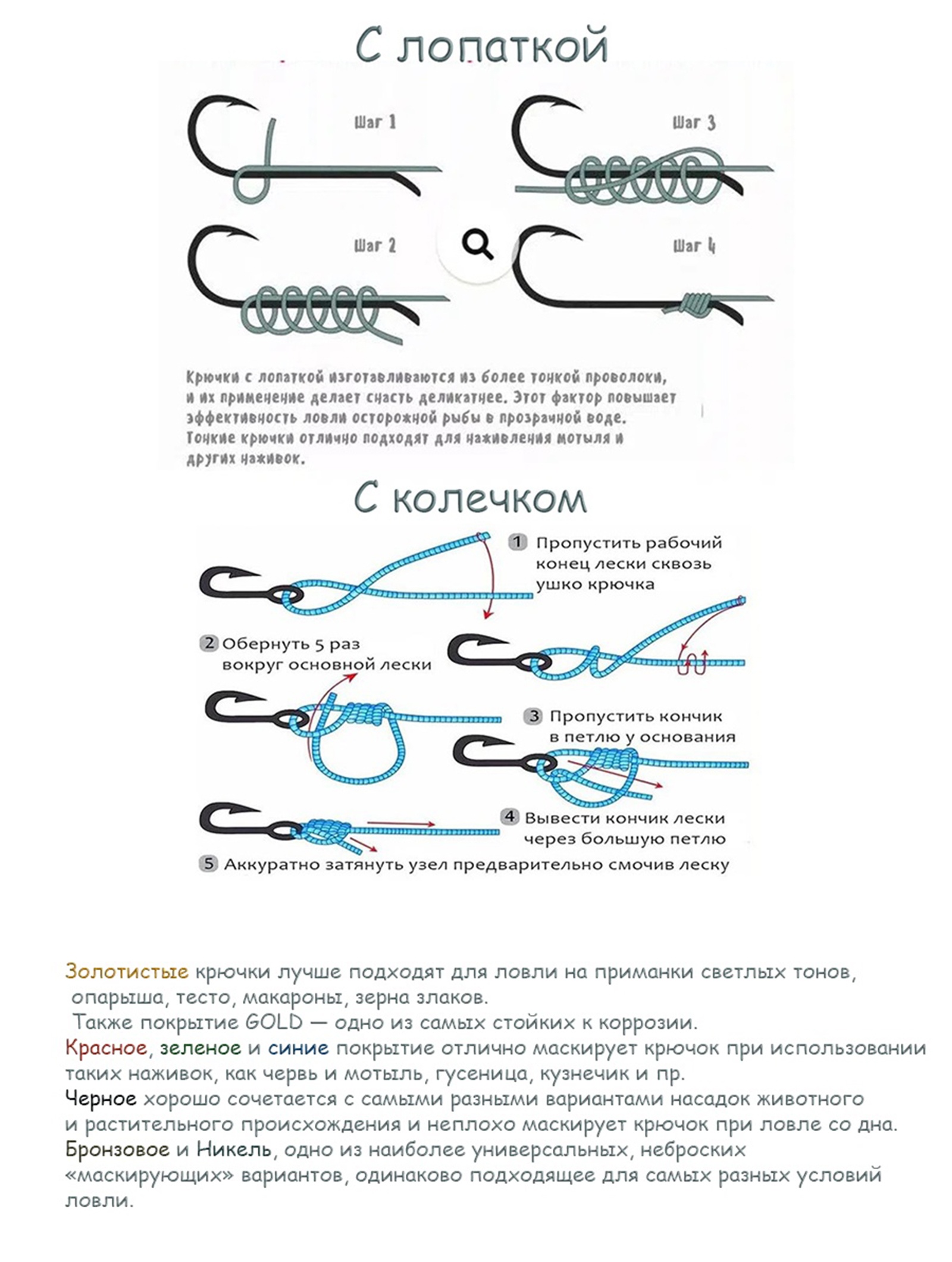 Самое стойкое на сегодняшний день покрытие Black Chrome обеспечивает возможность рыбалки как в соленой, так и в пресной воде. Крючок с отогнутым жалом. В некоторых случаях подобный изгиб улучшает засекаемость. Крючок с колечком. Наиболее популярный и распространенный тип крепления крючков. Кованый поддев крючка — при равном диаметре проволоки такие крючки мощнее, чем обычные.