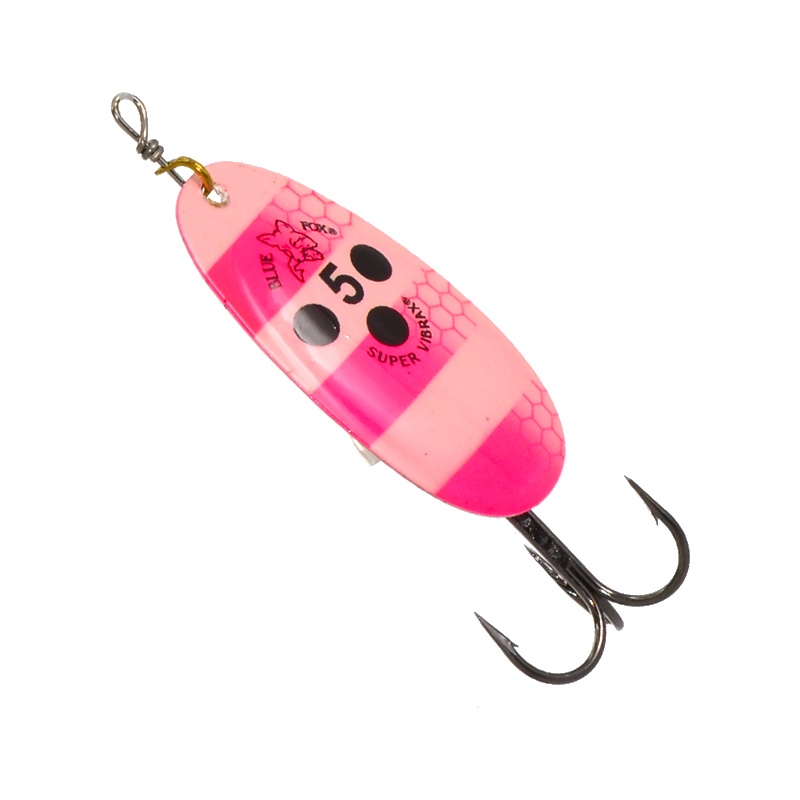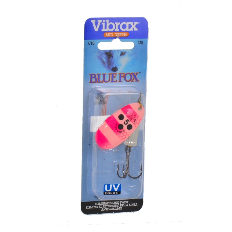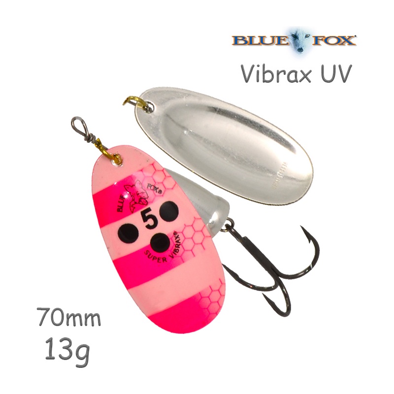 Благодаря новой расцветке, блесна Blue Fox Vibrax UV способна спровоцировать даже самых пассивных рыб. Правильная проводка создает по-настоящему качественную анимацию. Точки на ярком фоне, в процессе вращения, привлекают еще больше хищников, а свечение в ультрафиолетовых лучах делает блесну эффективной даже на довольно большой глубине. По своей конструкции эта модель мало чем отличается от основной серии Vibrax: стержень, тройник, яркий лепесток. При этом размер, вес и цветовые композиции могут варьироваться. Блесна Blue Fox Vibrax UV обладает массой от 6 до 18 гр., несмотря на свой относительно небольшой размер. Это обусловлено тем, что данные приманки частично выполнены из латуни – более плотного металла, чем привычная сталь. Так, блесны линейки Vibrax UV хорошо подходят для ловли практически на любой глубине, стоит лишь выбрать подходящий для водоема вариант.