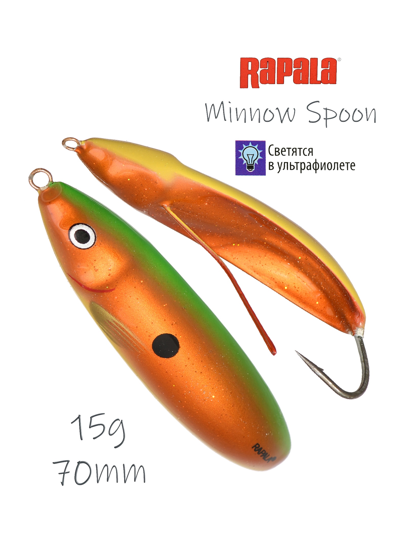Minnow Spoon от финской фирмы Rapala, известный всем рыбакам "вездеход", запатентованная конструкция анти зацеп творит чудеса в заросших водоемах и торфяниках, где ловля на другие приманки приводит лишь к боли их потерь. Minnow Spoon любит неторопливую проводку, при ней приманка идеально описывает зигзаги и не сбивает игру, которая заложена в её конструкции и форме тела. Также можно делать небольшие паузы, на которых блесна Minnow Spoon планируя, погружается на дно, поднимая облачко мути, и в это время делаем короткую подтяжку (3-5 см.), и снова продолжаем равномерную проводку. Неплохо облавливать ею окна в растительности на сваливание с кувшинок и погружении вдоль стеблей, как раненная рыбка.