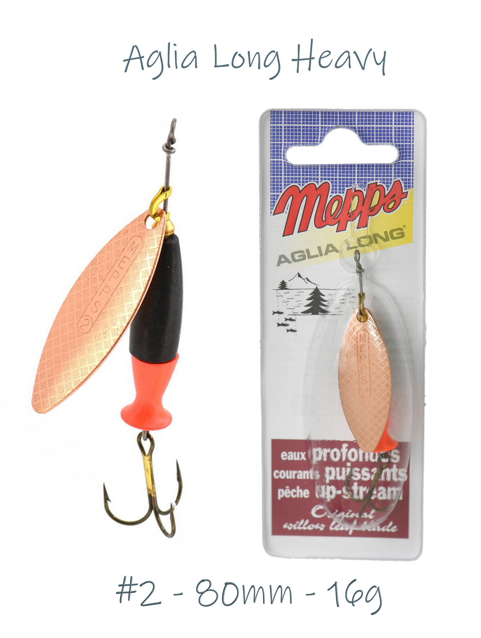 Благодаря своему "ивовому" лепестку и более тяжелому весу Aglia Long хорошо держит медленное и стабильное вращение на самых сильных течениях. Рекомендуются для плотных потоков, быстрой и глубокой воды и для ловли против течения. Также хороша и для использования в озерах при охоте на донных хищников, которые не реагируют на быстроходные приманки.
