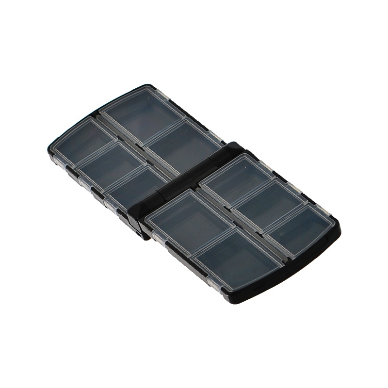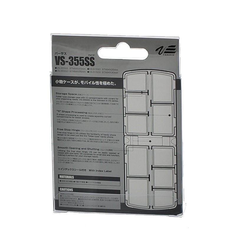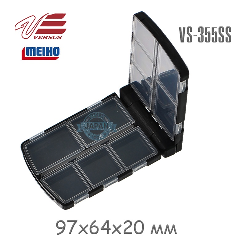 VS-355SS самая тонкая модель в серии. С обеих сторон по пять ячеек глубиной 7 мм, общая высота рыболовной коробочки — 2 см. Каждая ячейка закрывается отдельной крышкой.