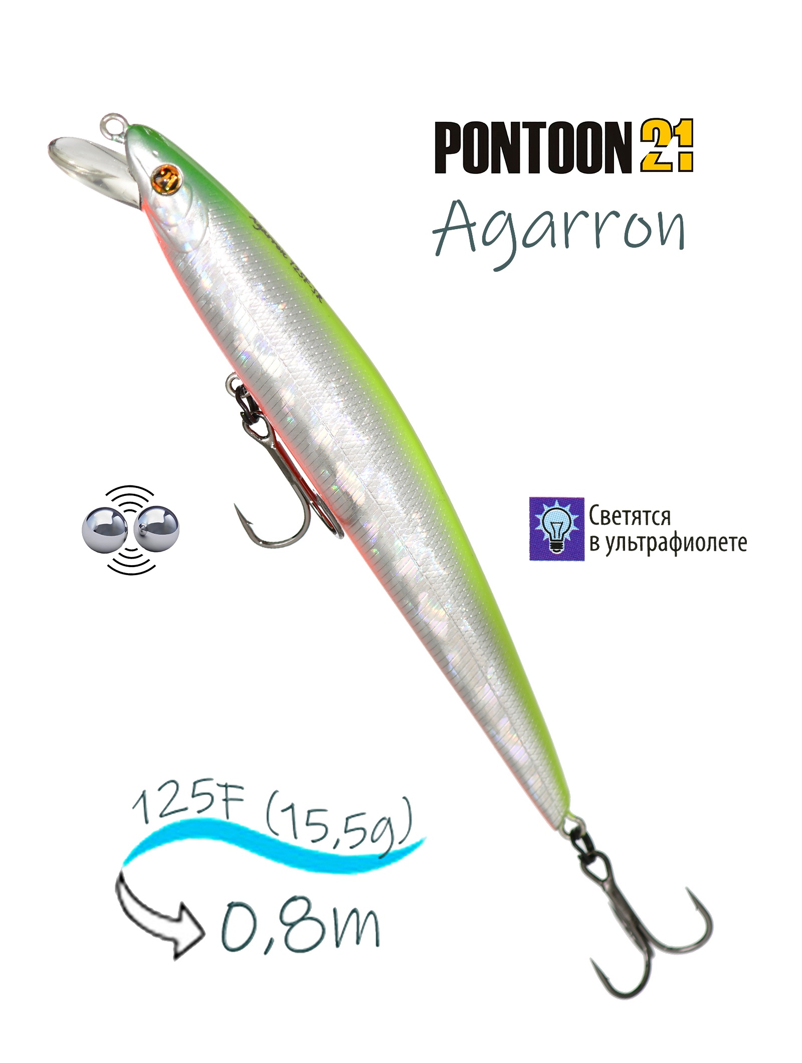 Agarron — первое семейство специализированных воблеров компании Pontoon21, ориентированных на ловлю щуки. При его создании конструкторы Pontoon21 основывались, прежде всего, на известных на сегодняшний день поведенческих особенностях этого хищника.
