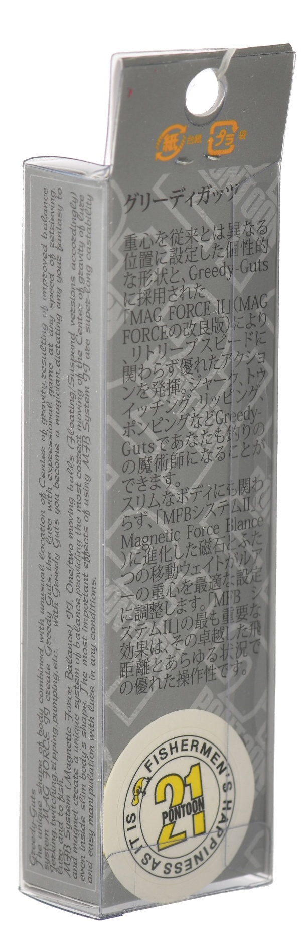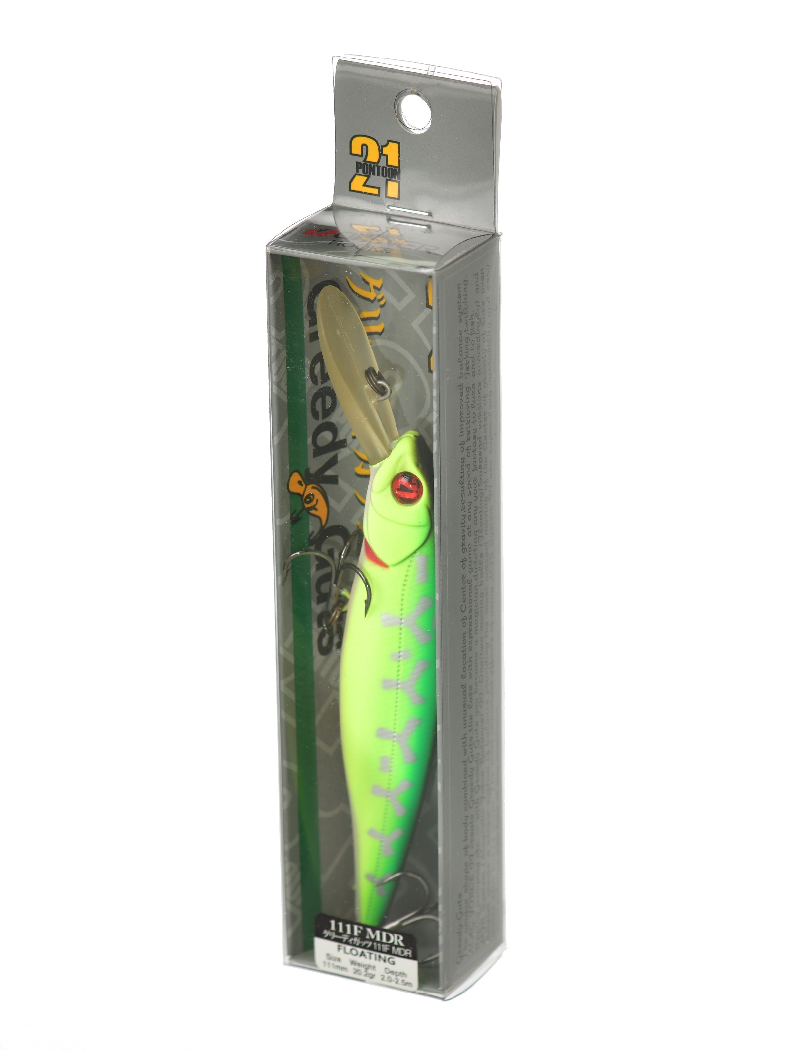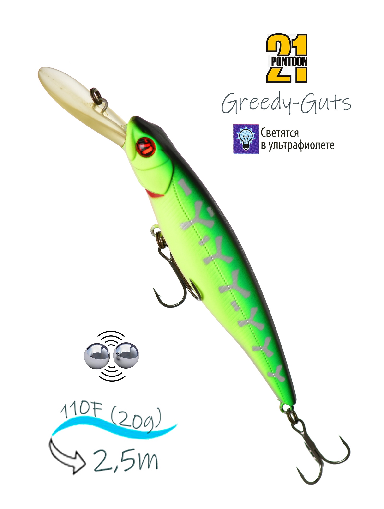 Этой серией воблеров Pontoon 21 открывает новую серию своих приманок – активных и легко управляемых воблеров- минноу . В дословном переводе Greedy Guts означает ни что иное, как «вертлявый обжора». И действительно, своим внешним видом и особенно отвисшим распирающим брюшком эти воблеры напоминают сильно объевшегося малька. Такая конструктивная особенность не случайна. Объемом брюшке воблера искусно размещены два достаточно увесистых груза-балансира системы Mag Force Balance II.