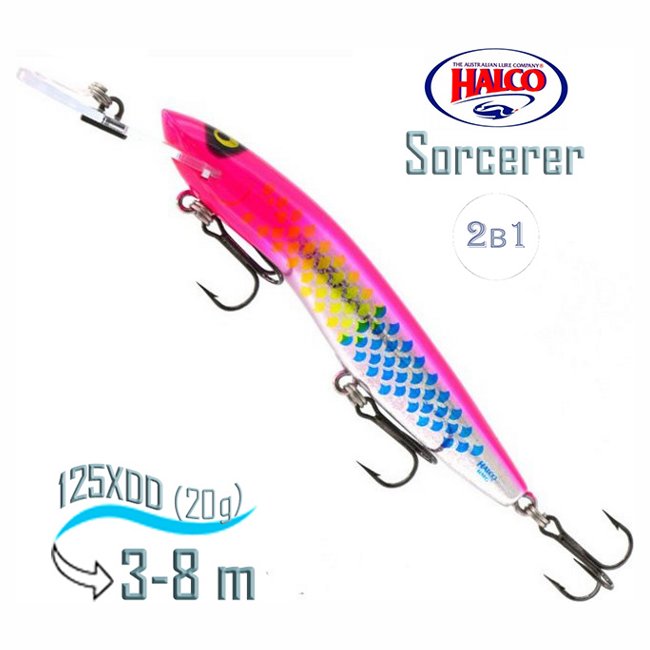 Halco Sorcerer, имеет форму миннов, сплюснутая по горизонтали в передней части и по вертикали в хвостовой, дали неожиданно натуральную игру приманки с покачиваниями телом и развалистой траекторией проводки. Все Sorcerer идеально держат течение, благодаря килю под задним плавником.