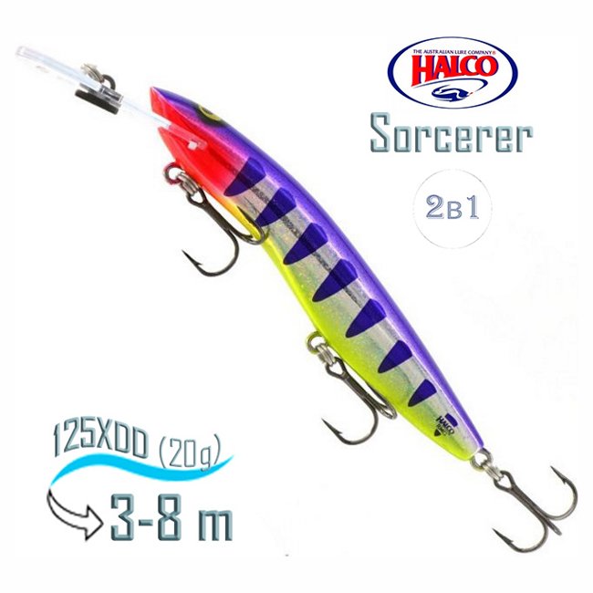Halco Sorcerer, имеет форму миннов, сплюснутая по горизонтали в передней части и по вертикали в хвостовой, дали неожиданно натуральную игру приманки с покачиваниями телом и развалистой траекторией проводки. Все Sorcerer идеально держат течение, благодаря килю под задним плавником.