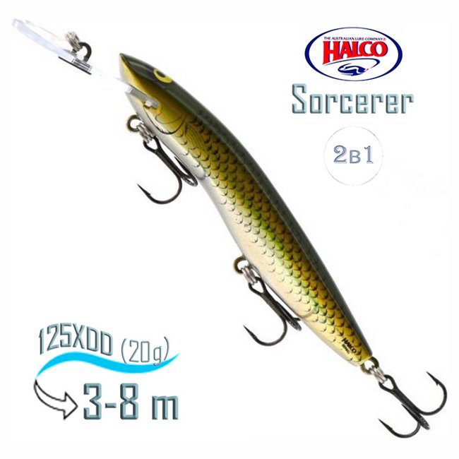 Halco Sorcerer, имеет форму миннов, сплюснутая по горизонтали в передней части и по вертикали в хвостовой, дали неожиданно натуральную игру приманки с покачиваниями телом и развалистой траекторией проводки. Все Sorcerer идеально держат течение, благодаря килю под задним плавником.
