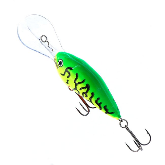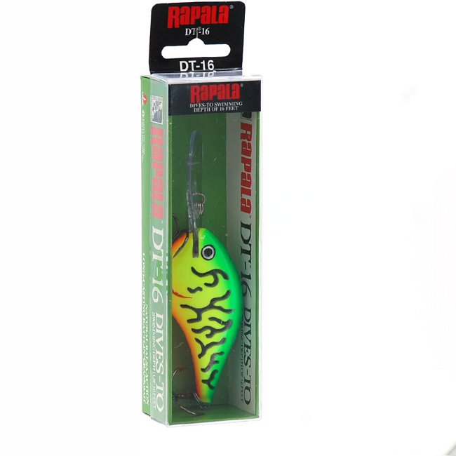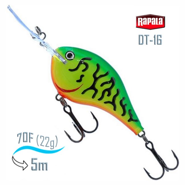 Серия воблеров Rapala DT (Dives-To) Series относится к типу приманок крэнкбейты или крэнки. Располагаясь при проводке под углом, приманка первый удар принимает на лопасть. После чего переваливается через лежащее на дне бревно или корягу, в то время как тройники находятся в безопасность позади широкой лопатки и не испытывают с препятствием никакого контакта.