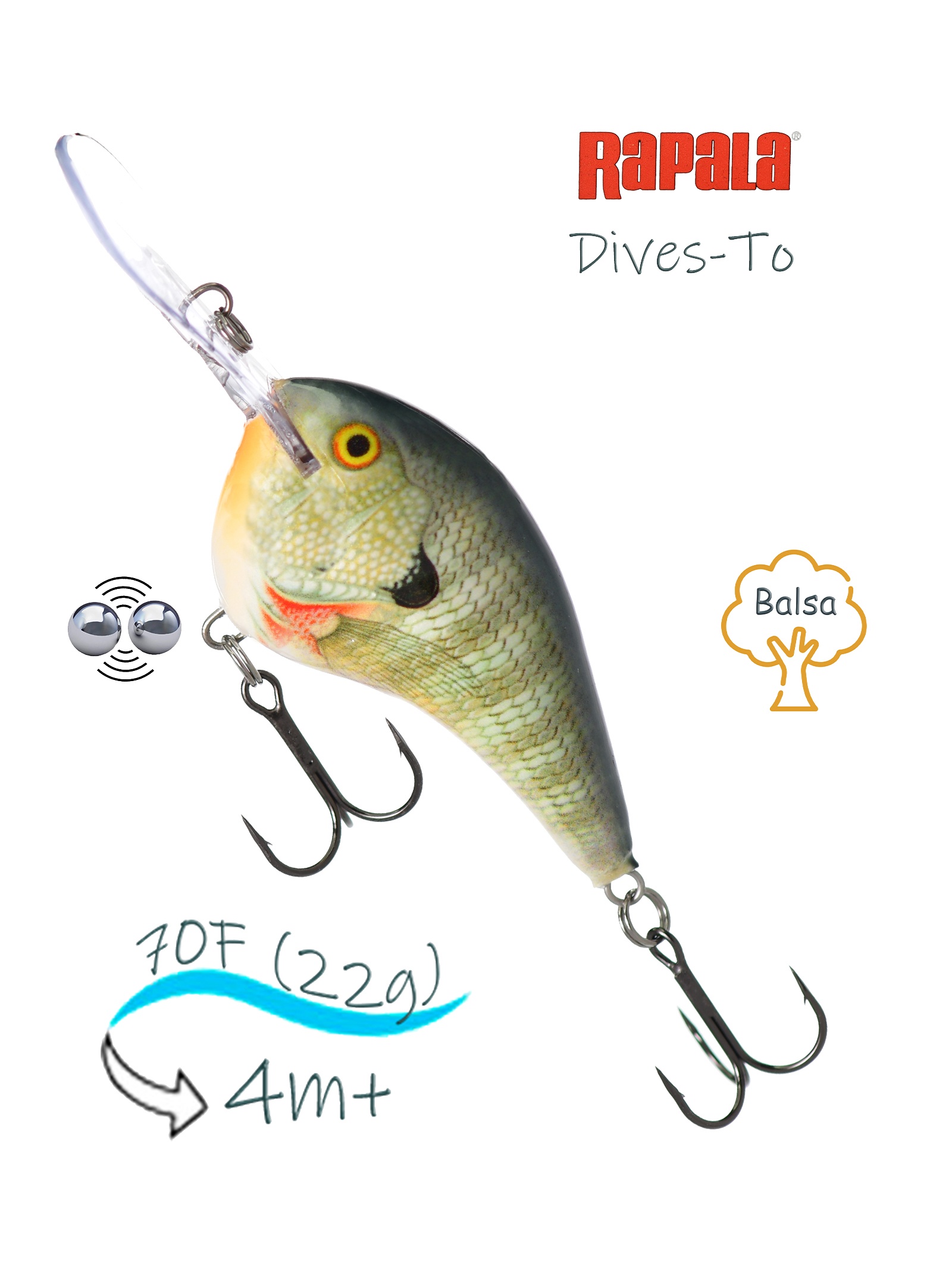 Воблер Rapala DT (Dives-To) - это плод более чем тридцатилетних экспериментов, постоянных испытаний и работы над идеальной спиннинговой приманкой Davida Fritta (американского авторитета в области спиннинга). Идея заключалась в том, чтобы создать воблер, который быстро ныряет, входит на территорию кормежки рыб и остается там дольше, чем какая-либо другая искусственная приманка.