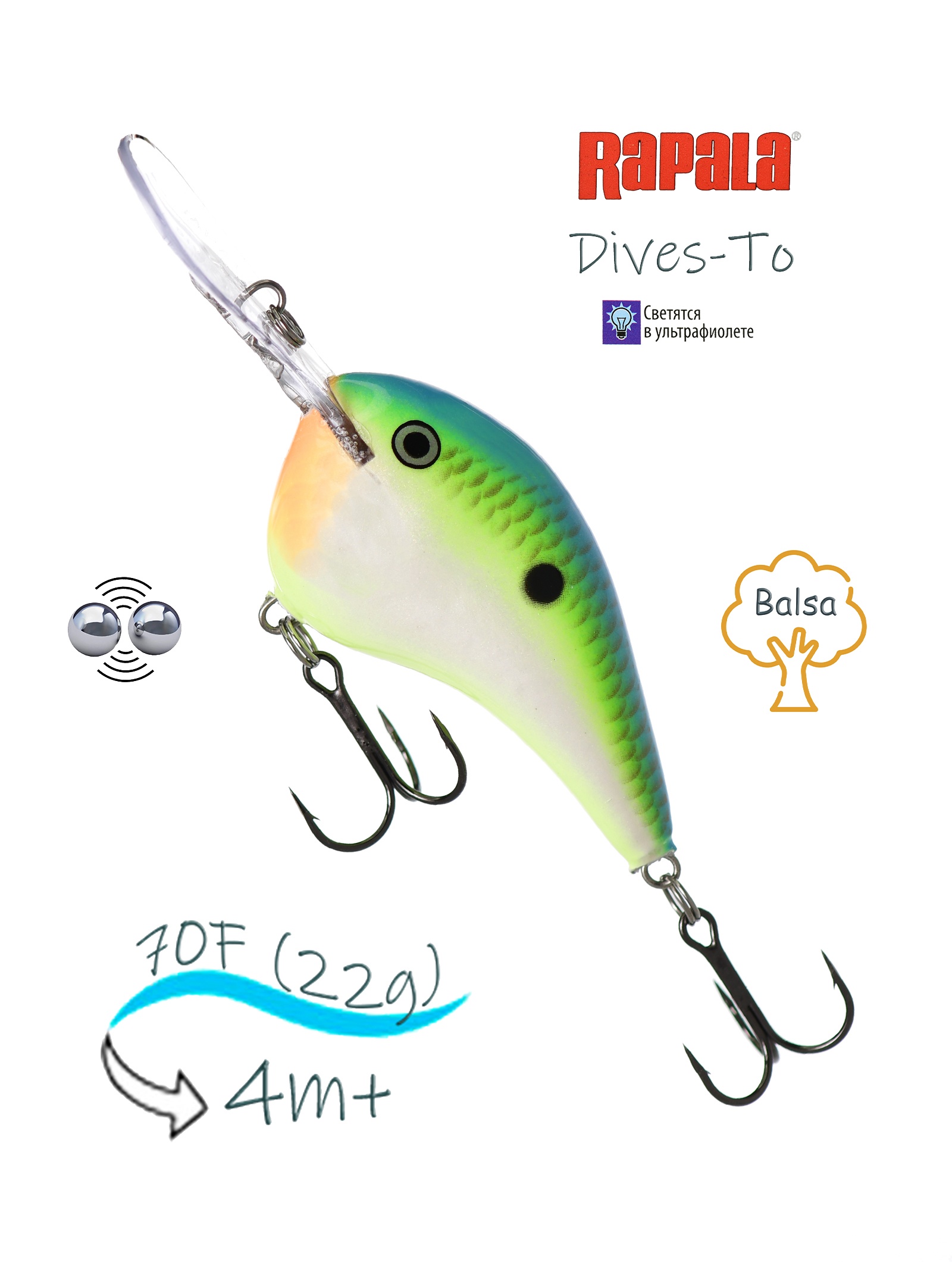 Воблер Rapala DT (Dives-To) - это плод более чем тридцатилетних экспериментов, постоянных испытаний и работы над идеальной спиннинговой приманкой Davida Fritta (американского авторитета в области спиннинга). Идея заключалась в том, чтобы создать воблер, который быстро ныряет, входит на территорию кормежки рыб и остается там дольше, чем какая-либо другая искусственная приманка.