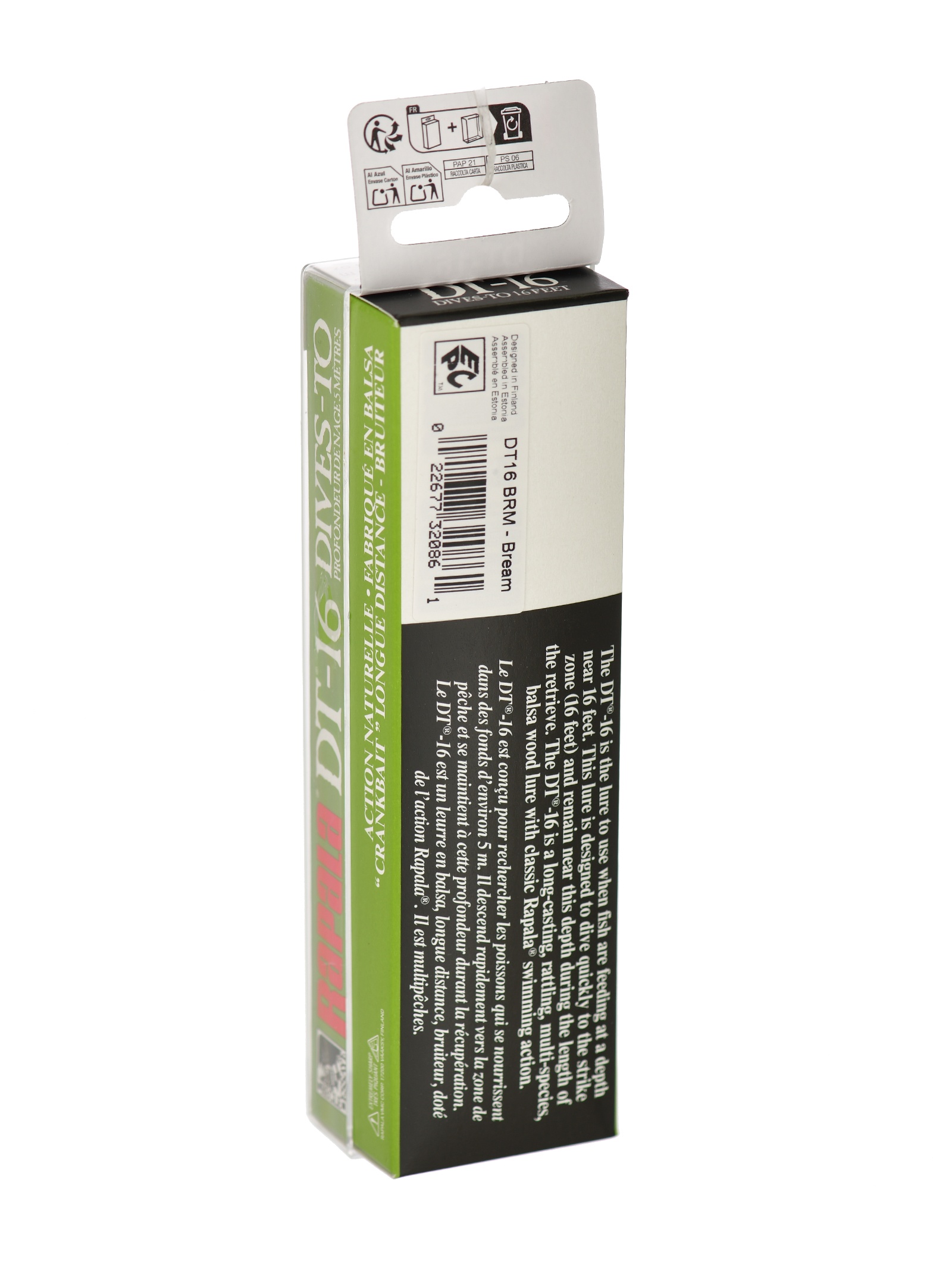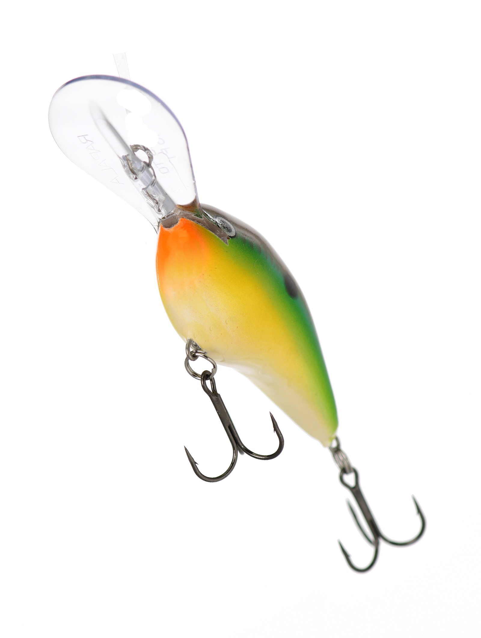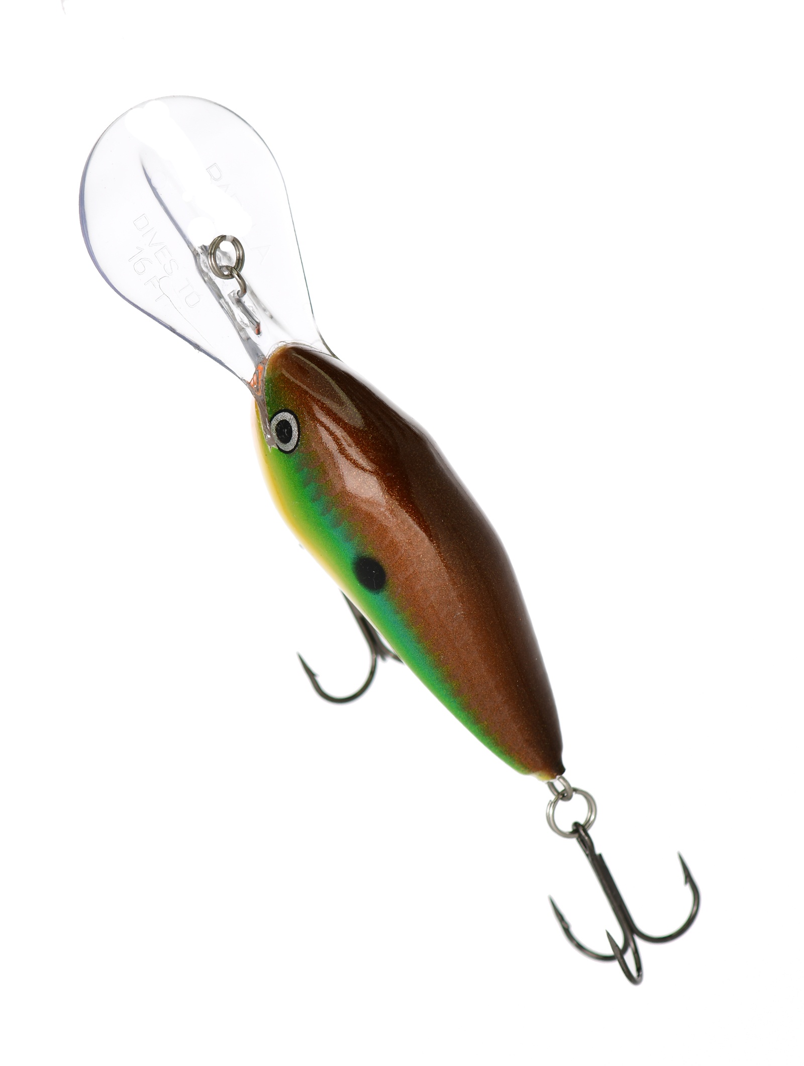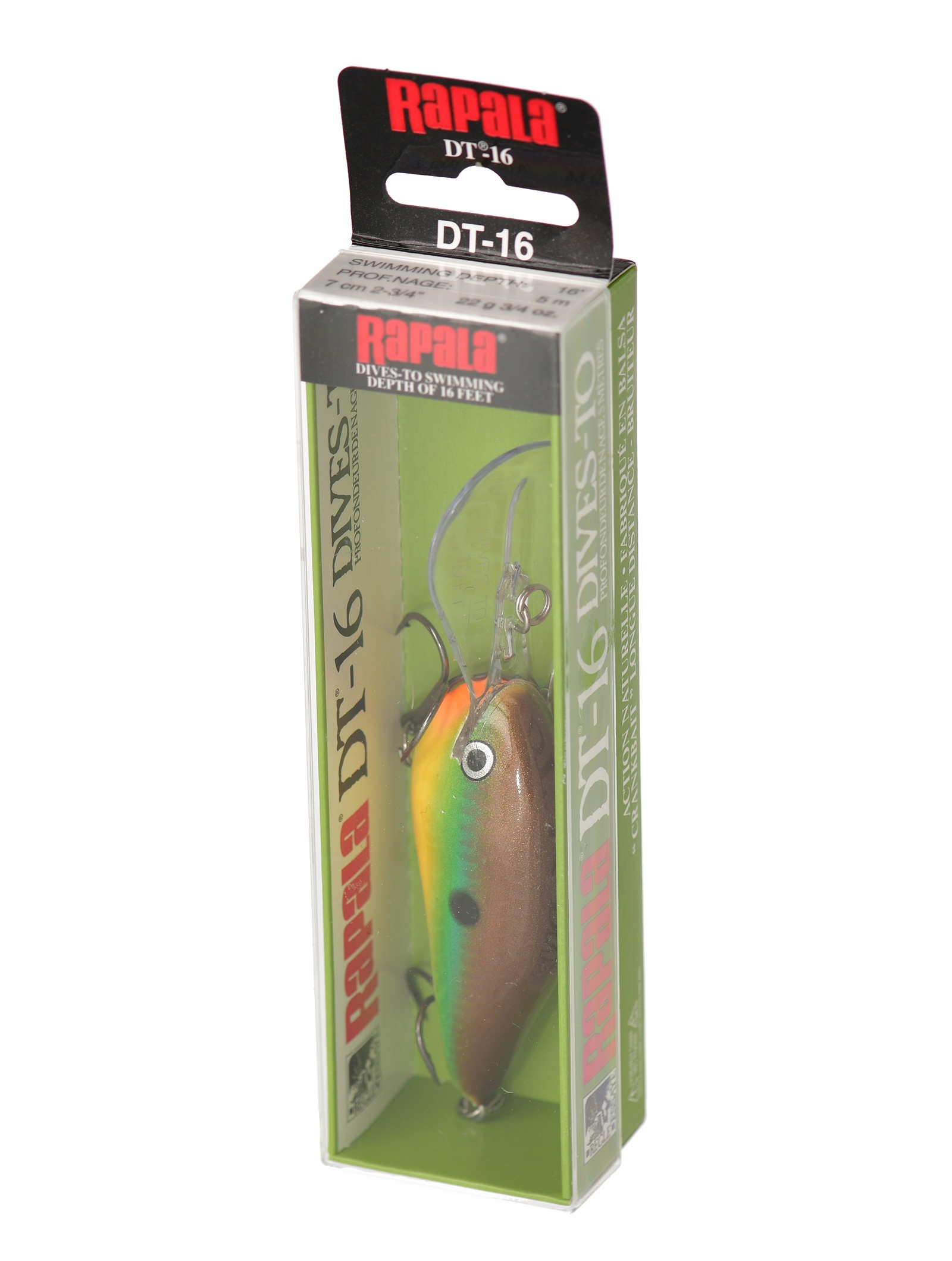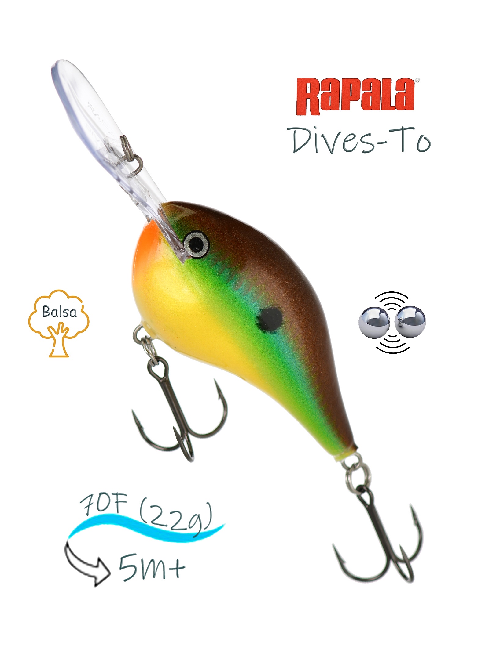 Серия воблеров Rapala DT (Dives-To) Series относится к типу приманок крэнкбейты или крэнки. Располагаясь при проводке под углом, приманка первый удар принимает на лопасть. После чего переваливается через лежащее на дне бревно или корягу, в то время как тройники находятся в безопасность позади широкой лопатки и не испытывают с препятствием никакого контакта.