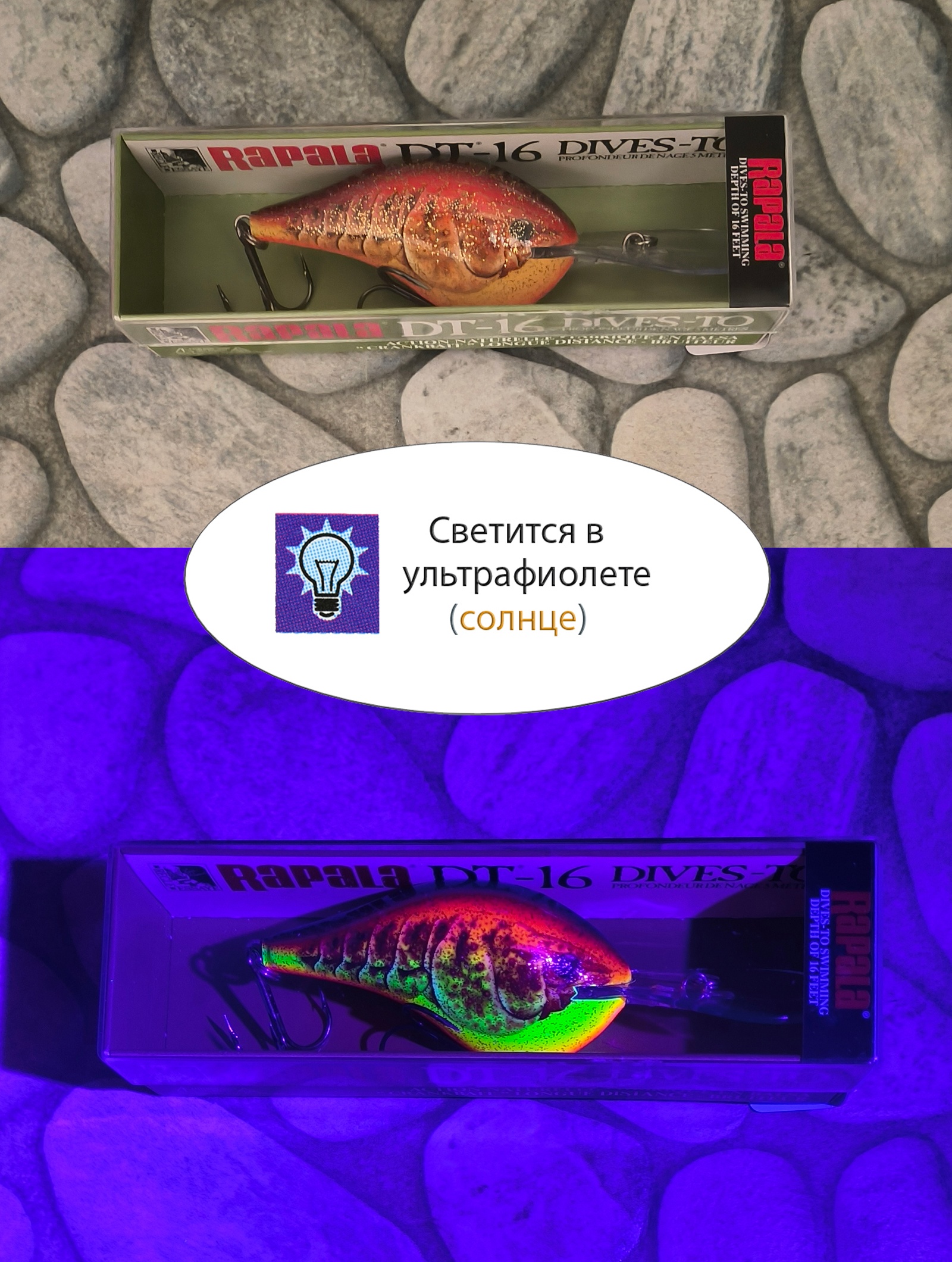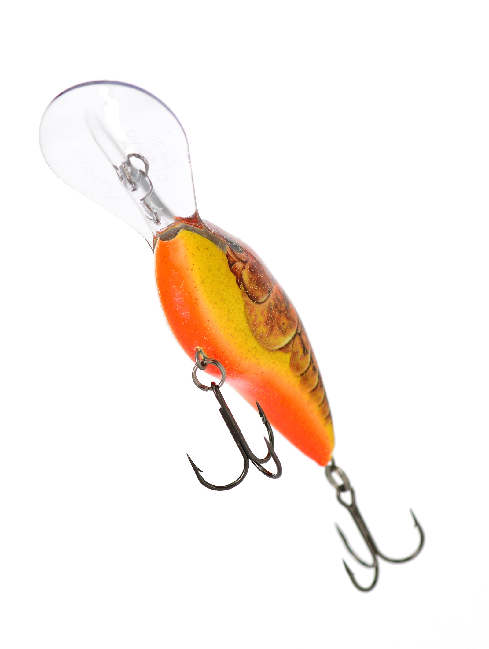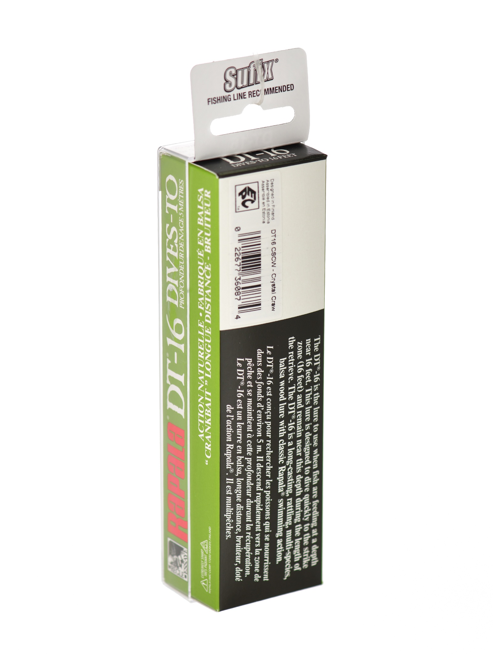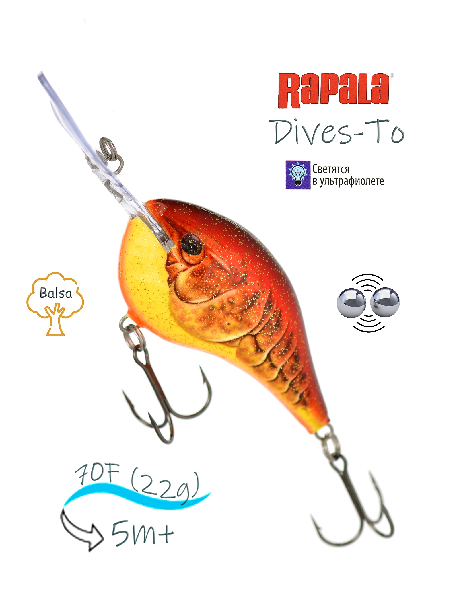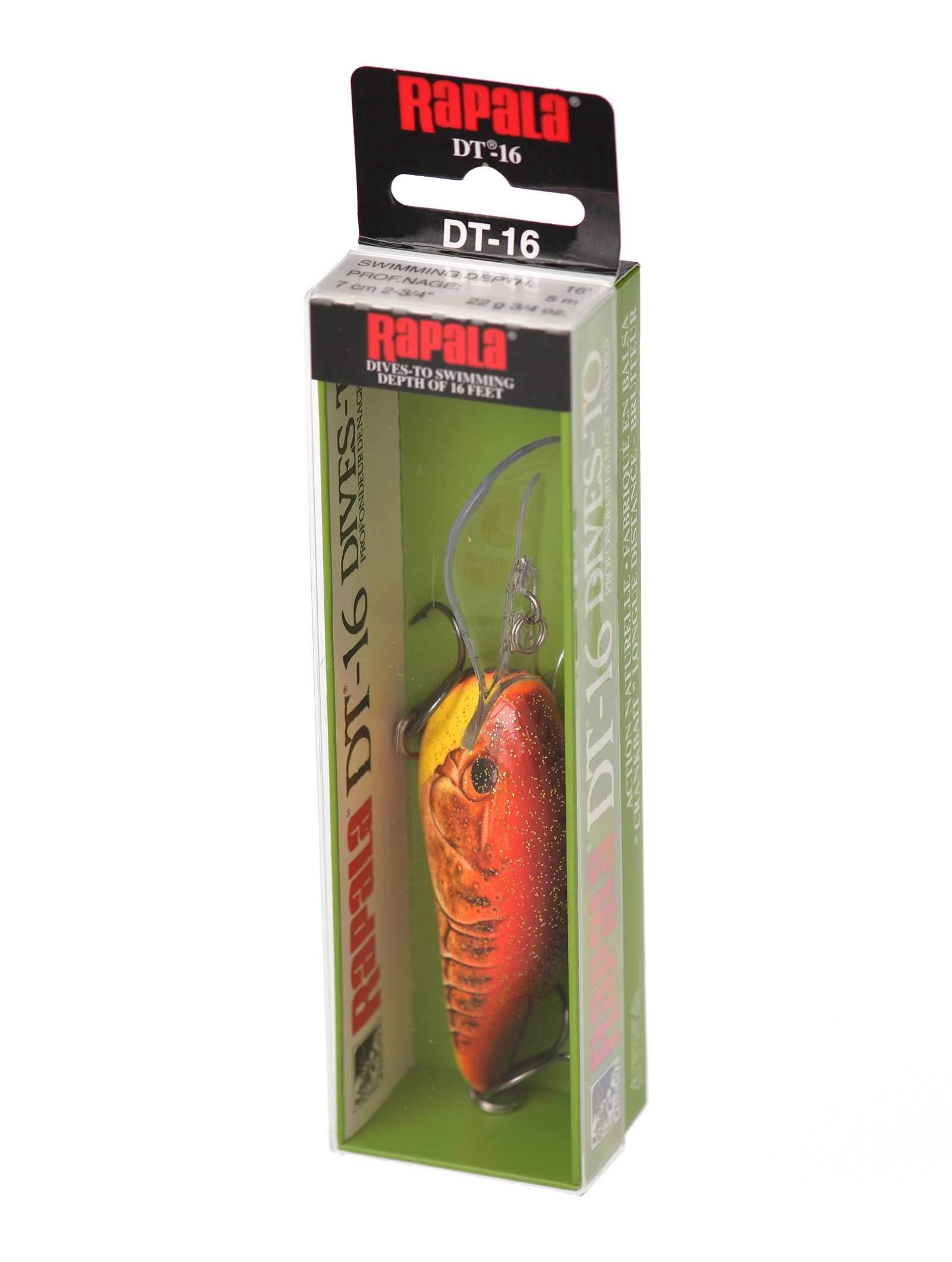Серия воблеров Rapala DT (Dives-To) Series относится к типу приманок крэнкбейты или крэнки. Располагаясь при проводке под углом, приманка первый удар принимает на лопасть. После чего переваливается через лежащее на дне бревно или корягу, в то время как тройники находятся в безопасность позади широкой лопатки и не испытывают с препятствием никакого контакта.