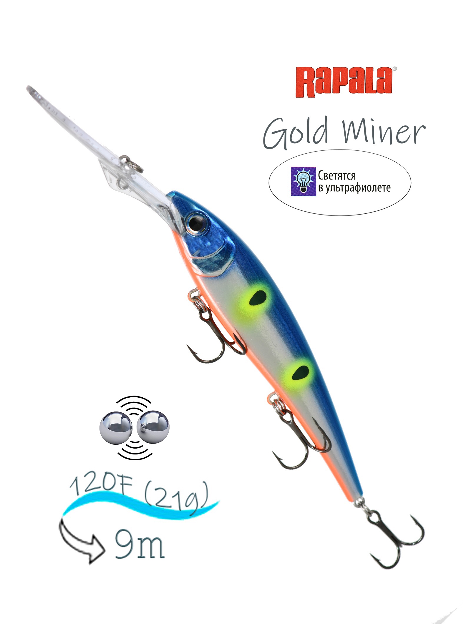 Gold Miner - воблер для ловли крупной и сильной рыбы. Тело изготовлено из прочного пластика. Разработан для пресноводного троллинга, быстро ныряет на глубину 9 метров без дополнительного оборудования и утяжеления. Восхитительно работает как при быстрой, так и при медленной скорости проводки. Gold Miner отличается сильно выраженными, мощными хвостовыми колебаниями, которые дополняются звуковым эффектом от внутренней камеры с шариками. Выбор комбинаций цветов и рисунков основывается на опыте профессиональных рыбаков по всему миру. Воблеры для ловли щуки, судака, сома и других крупных хищников в реках и озёрах. Оснащены острейшими тройными крючками VMC 4551 BN (чёрный никель).