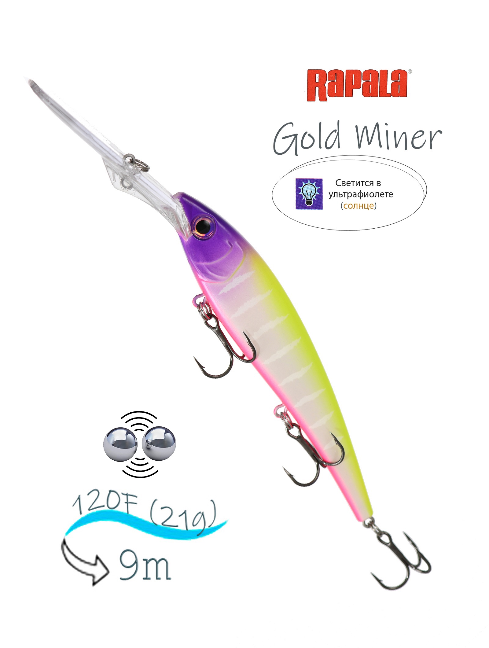 Gold Miner - воблер для ловли крупной и сильной рыбы. Тело изготовлено из прочного пластика. Разработан для пресноводного троллинга, быстро ныряет на глубину 9 метров без дополнительного оборудования и утяжеления. Восхитительно работает как при быстрой, так и при медленной скорости проводки. Gold Miner отличается сильно выраженными, мощными хвостовыми колебаниями, которые дополняются звуковым эффектом от внутренней камеры с шариками. Выбор комбинаций цветов и рисунков основывается на опыте профессиональных рыбаков по всему миру. Воблеры для ловли щуки, судака, сома и других крупных хищников в реках и озёрах. Оснащены острейшими тройными крючками VMC 4551 BN (чёрный никель).