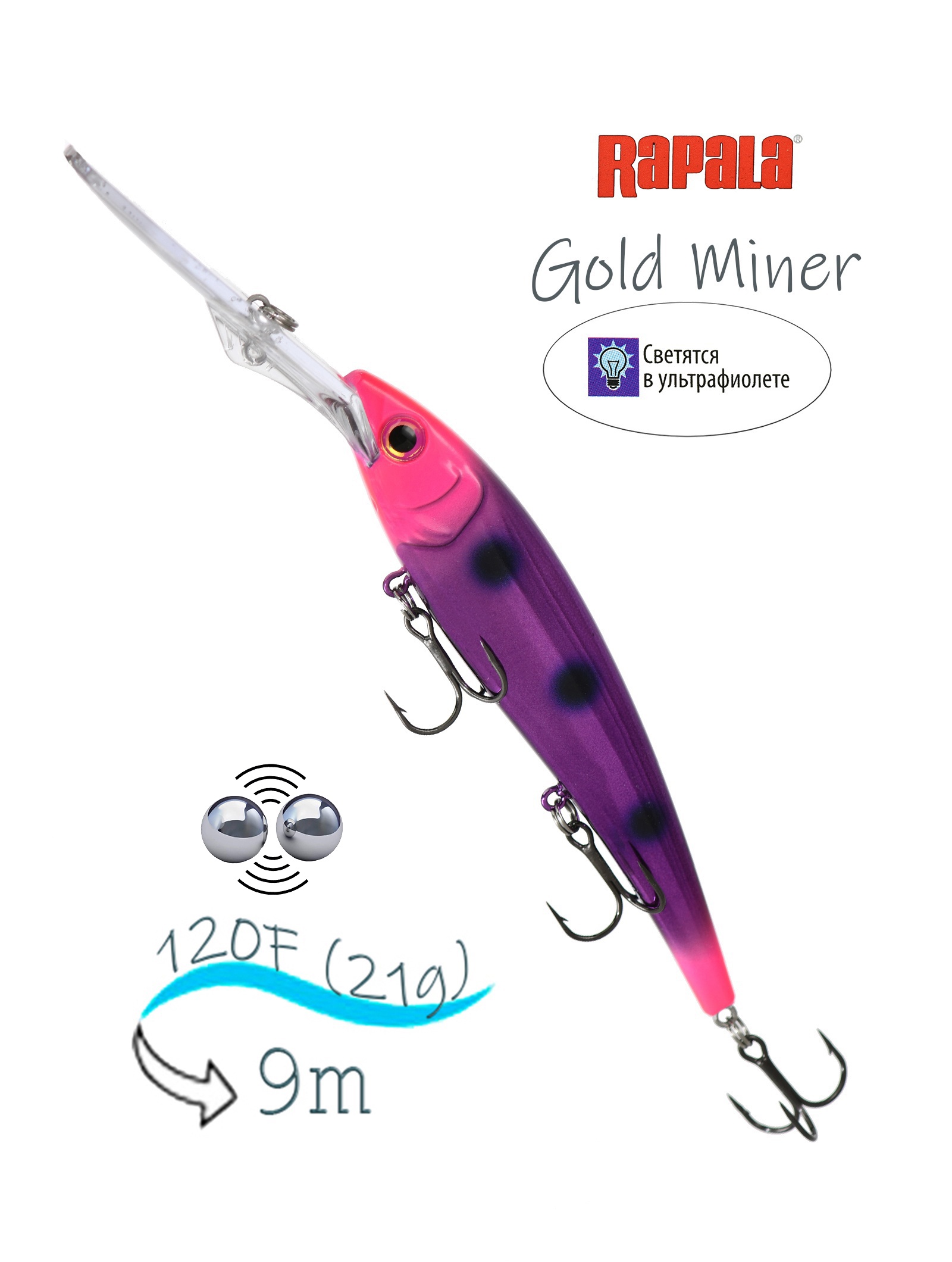 Gold Miner - воблер для ловли крупной и сильной рыбы. Тело изготовлено из прочного пластика. Разработан для пресноводного троллинга, быстро ныряет на глубину 9 метров без дополнительного оборудования и утяжеления. Восхитительно работает как при быстрой, так и при медленной скорости проводки. Gold Miner отличается сильно выраженными, мощными хвостовыми колебаниями, которые дополняются звуковым эффектом от внутренней камеры с шариками. Выбор комбинаций цветов и рисунков основывается на опыте профессиональных рыбаков по всему миру. Воблеры для ловли щуки, судака, сома и других крупных хищников в реках и озёрах. Оснащены острейшими тройными крючками VMC 4551 BN (чёрный никель).