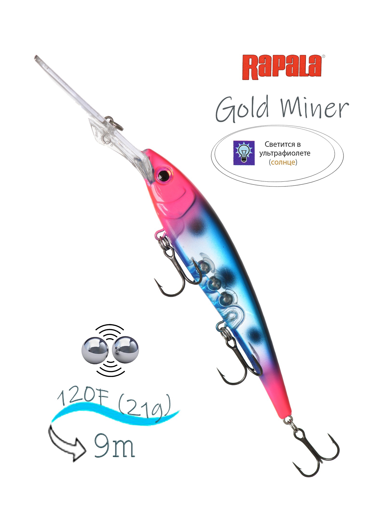 Gold Miner - воблер для ловли крупной и сильной рыбы. Тело изготовлено из прочного пластика. Разработан для пресноводного троллинга, быстро ныряет на глубину 9 метров без дополнительного оборудования и утяжеления. Восхитительно работает как при быстрой, так и при медленной скорости проводки. Gold Miner отличается сильно выраженными, мощными хвостовыми колебаниями, которые дополняются звуковым эффектом от внутренней камеры с шариками. Выбор комбинаций цветов и рисунков основывается на опыте профессиональных рыбаков по всему миру. Воблеры для ловли щуки, судака, сома и других крупных хищников в реках и озёрах. Оснащены острейшими тройными крючками VMC 4551 BN (чёрный никель).
