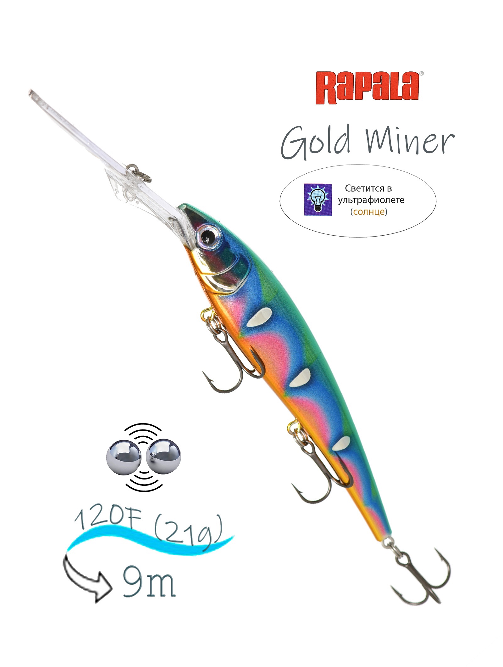 Gold Miner - воблер для ловли крупной и сильной рыбы. Тело изготовлено из прочного пластика. Разработан для пресноводного троллинга, быстро ныряет на глубину 9 метров без дополнительного оборудования и утяжеления. Восхитительно работает как при быстрой, так и при медленной скорости проводки. Gold Miner отличается сильно выраженными, мощными хвостовыми колебаниями, которые дополняются звуковым эффектом от внутренней камеры с шариками. Выбор комбинаций цветов и рисунков основывается на опыте профессиональных рыбаков по всему миру. Воблеры для ловли щуки, судака, сома и других крупных хищников в реках и озёрах. Оснащены острейшими тройными крючками VMC 4551 BN (чёрный никель).