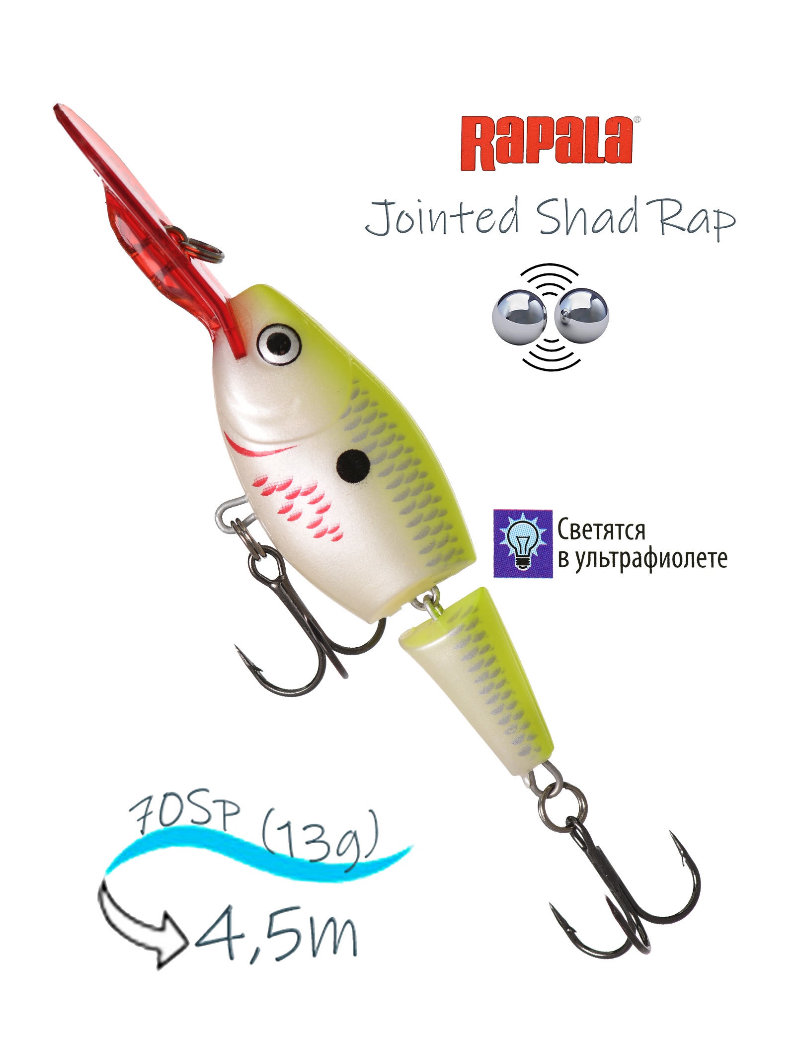 Составной воблер-шед Jointed Shad Rap от финского бренда Rapala отличается от знаменитого прототипа более мягкой и естественной игрой. Даже при медленной скорости проводки воблер соблазнительно играет, двигаясь по широкой амплитуде и напоминая маленькую рыбешку, перед которой не устоит ни один хищник. Дополнительной привлекательности приманке придает шумовая камера с металлическими шариками, расположенная в головном сегменте. Во время проводки шарики издают слышимое низкочастотное звучание, что служит дополнительной стимуляцией для хищника. Шарнирное соединение корпуса добавляет воблеру больше гибкости и плавности в движениях.