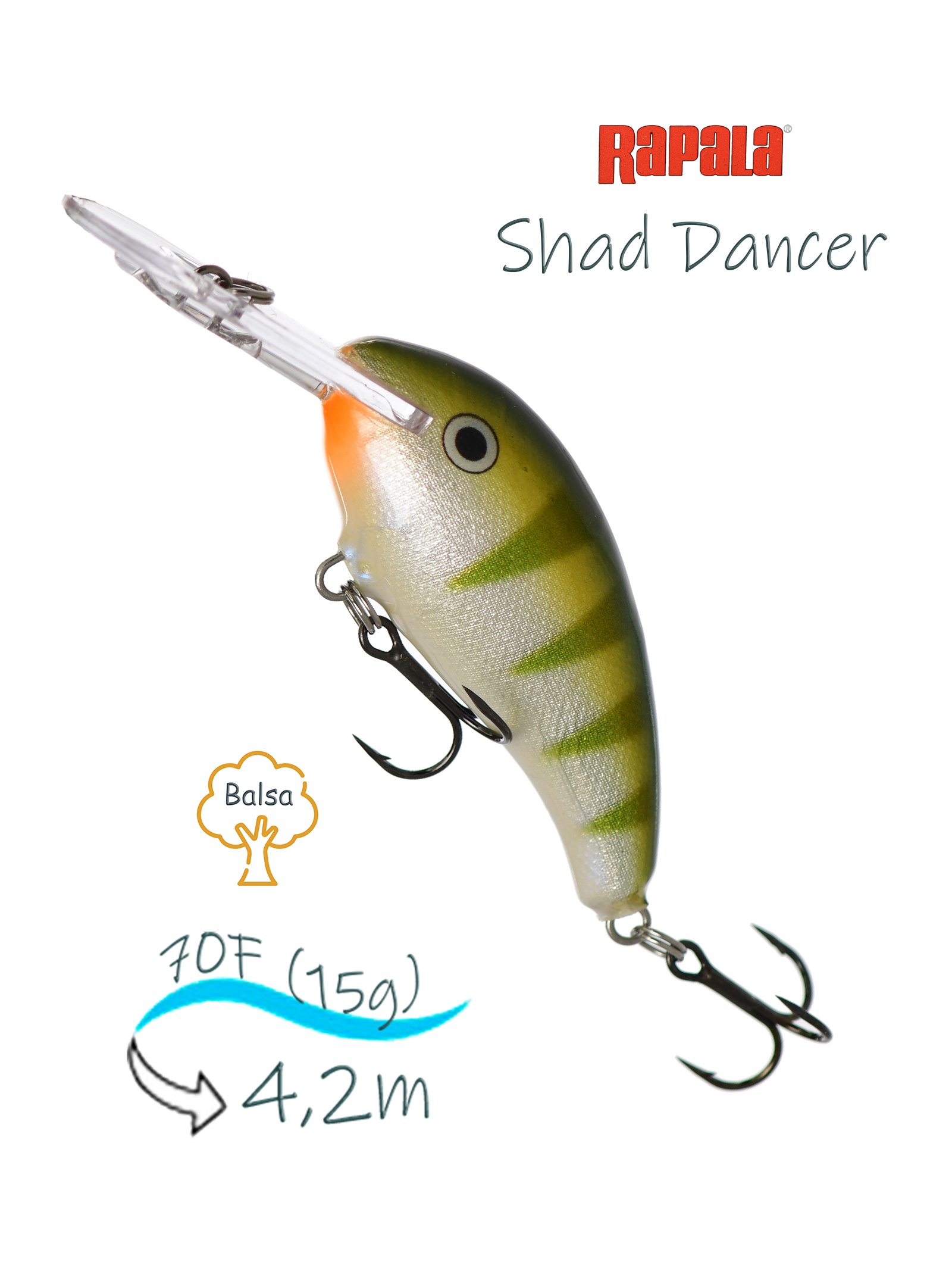 Воблер Rapala Shad Dancer относится к категории всесезонных универсальных приманок, одинаково эффективных против большинства видов хищников. По степени плавучести – это плавающий глубоководник с пределом горизонта от 2 до 3 метров.