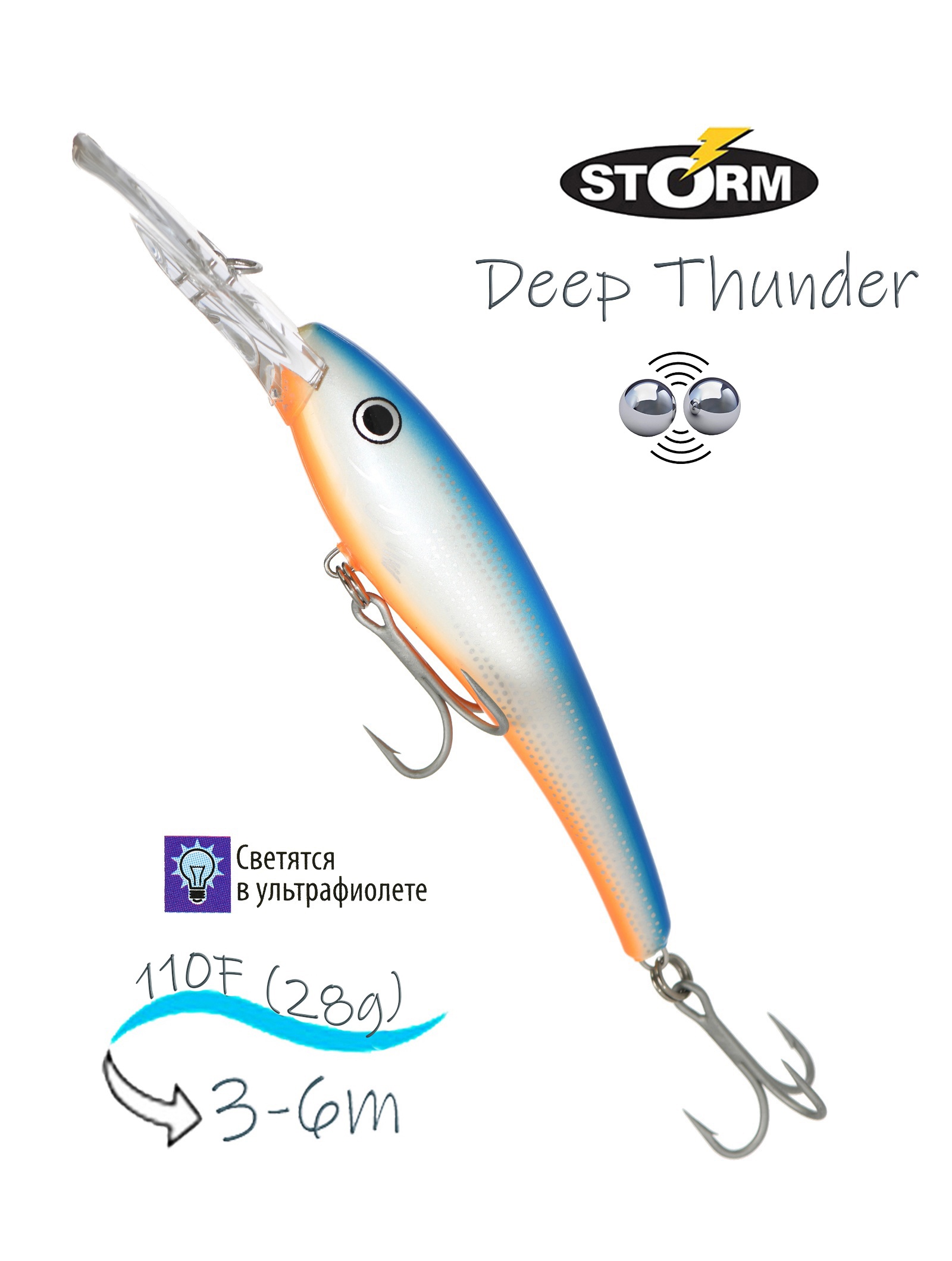 Storm Deep Nhunder, прекрасный представитель троллинговых воблеров с устойчивой игрой и широким диапазоном рабочей глубины (в зависимости от отпуска шнура). Воблер оснащается качественными тройниками VMC и окрашивается долговечными яхтенными лаками.