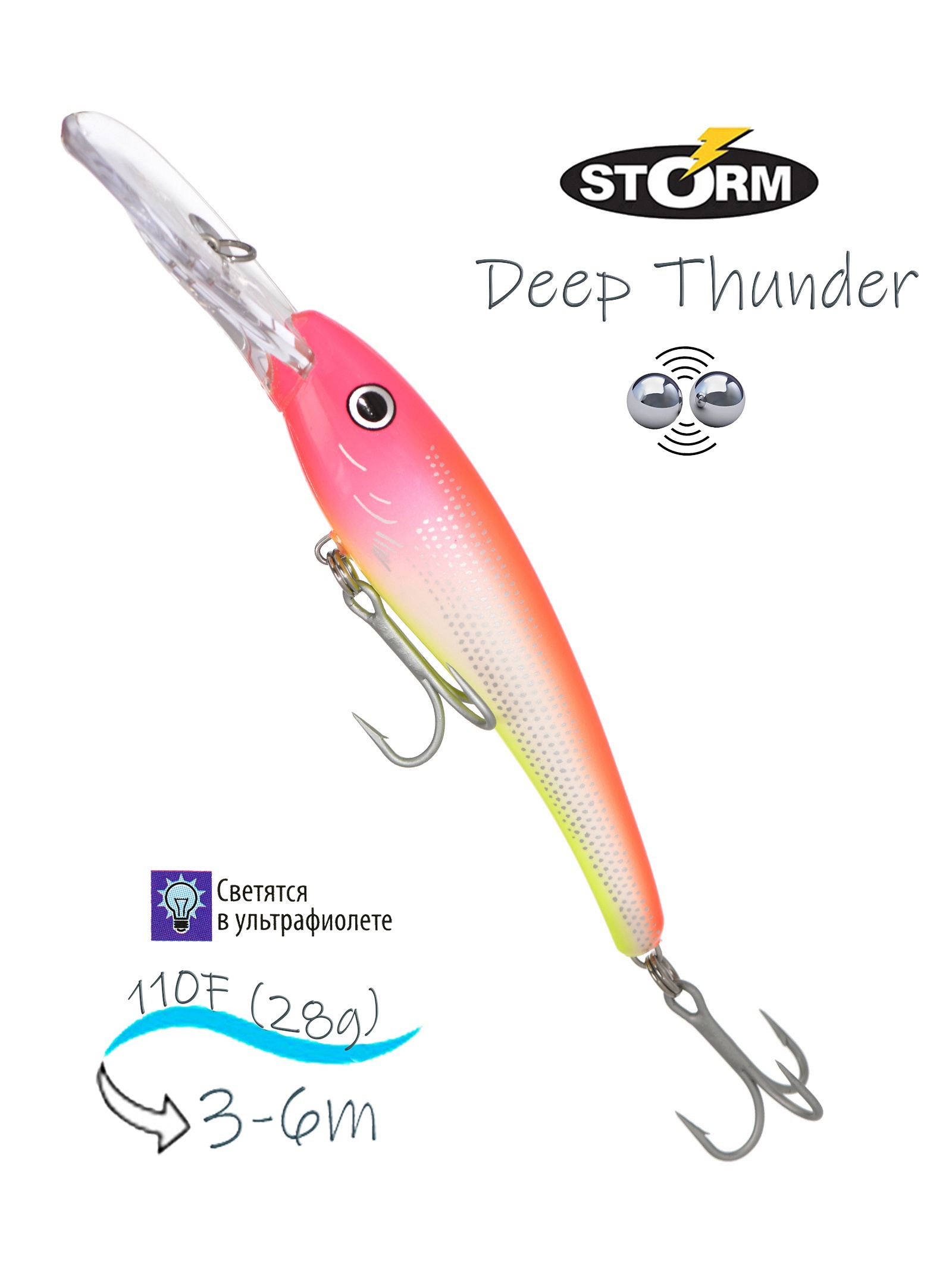 С английского языка слово Thunder переводится как "гром, грохот". Это указывает на мощные возмущения среды, которые порождает представленный минноу во время проводки. В таких условиях основная проводка - простая равномерка, на которой Deep Thunder от бренда Storm интенсивно колеблется. Учитывая, что предполагается борьба с сильными и активными хищниками, корпус приманки упрочнен, продумано крепление лопасти, установлены мощные тройники от бренда VMC.