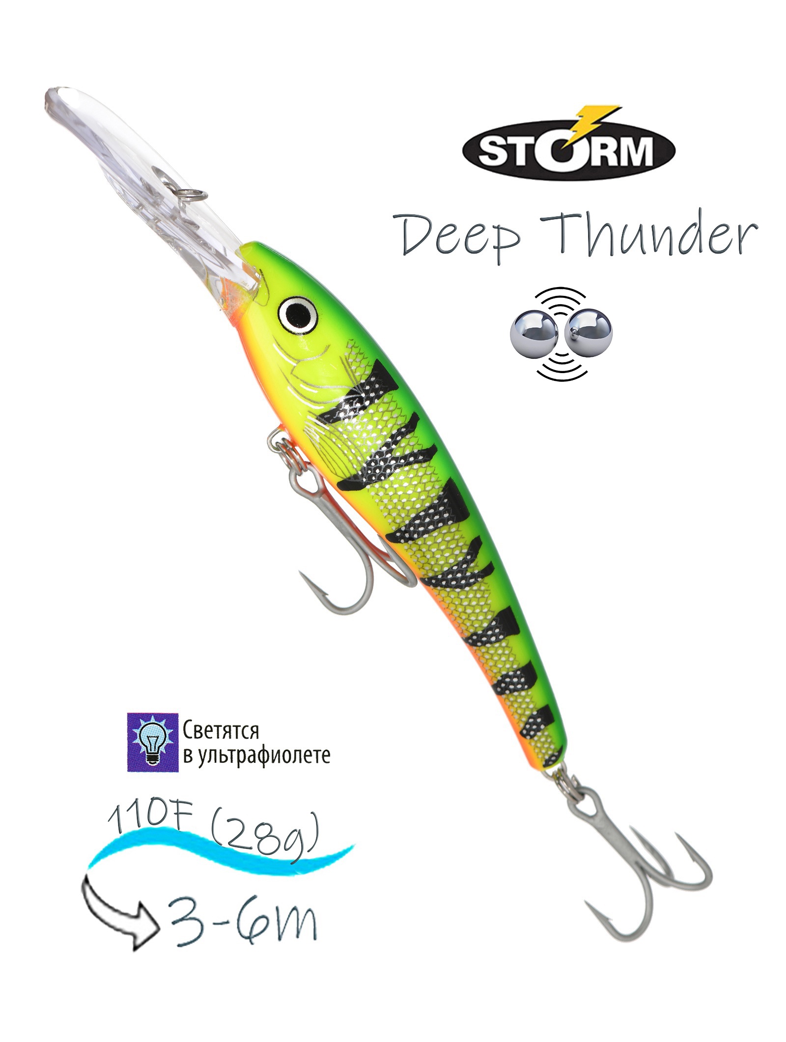 С английского языка слово Thunder переводится как "гром, грохот". Это указывает на мощные возмущения среды, которые порождает представленный минноу во время проводки. В таких условиях основная проводка - простая равномерка, на которой Deep Thunder от бренда Storm интенсивно колеблется. Учитывая, что предполагается борьба с сильными и активными хищниками, корпус приманки упрочнен, продумано крепление лопасти, установлены мощные тройники от бренда VMC.