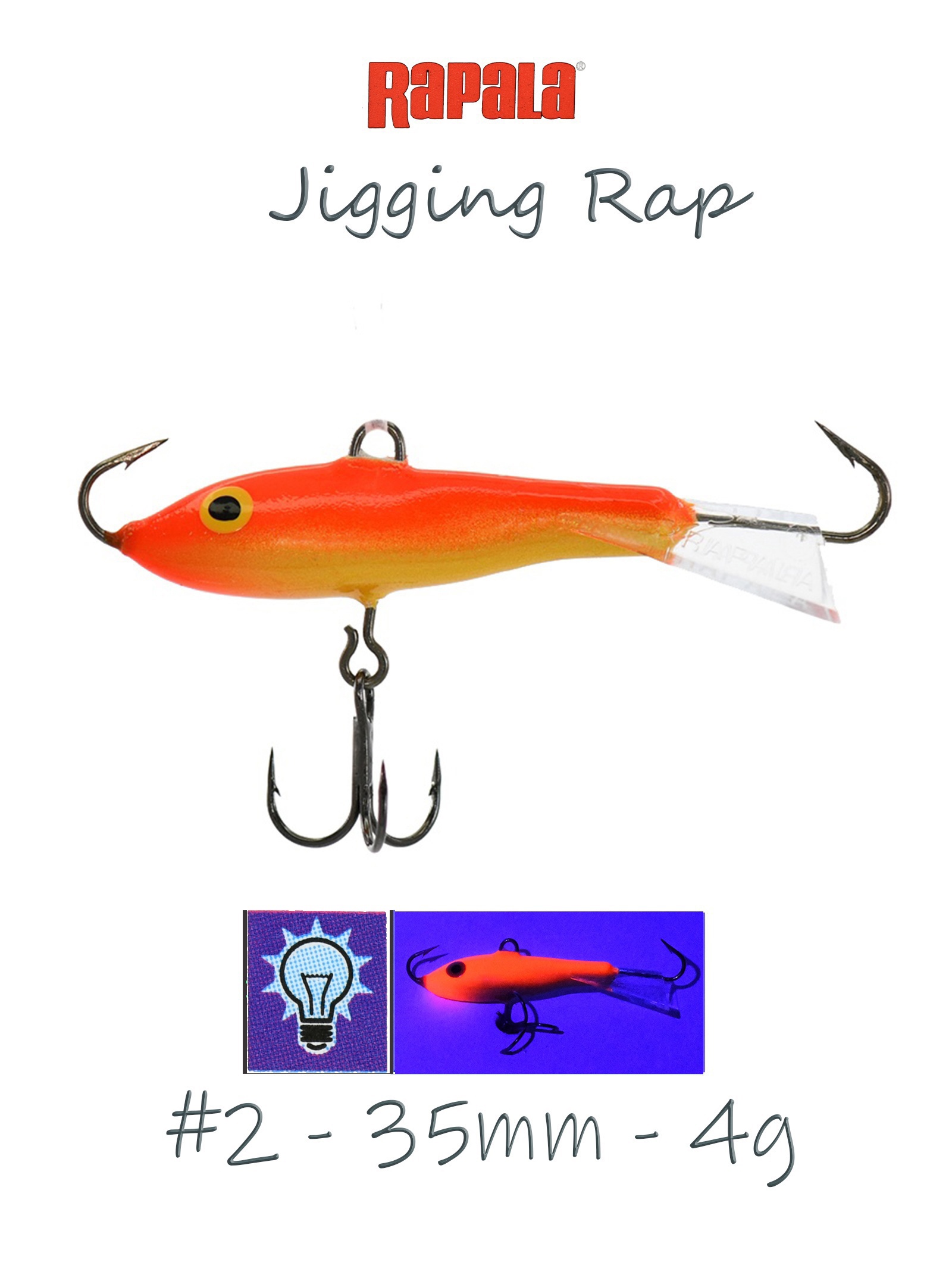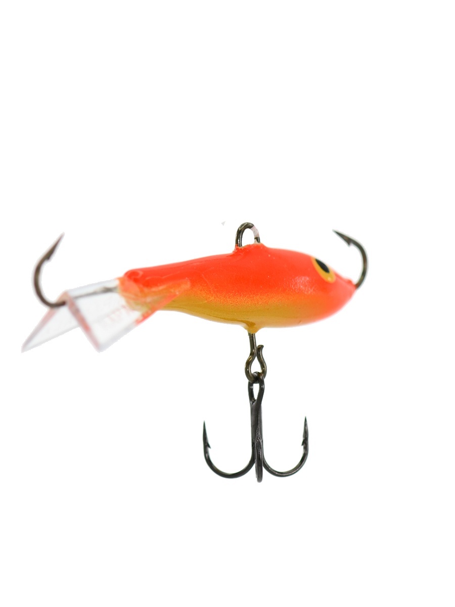 По форме балансир Rapala Jigging Rap напоминает небольшого малька уклейки, плотвички или окунька. Тело приманки вытянуто, немного сплюснуто по бокам. Форма балансира обеспечивает стабильную «восьмерку» и среднюю амплитуду отклонений от оси лунки.