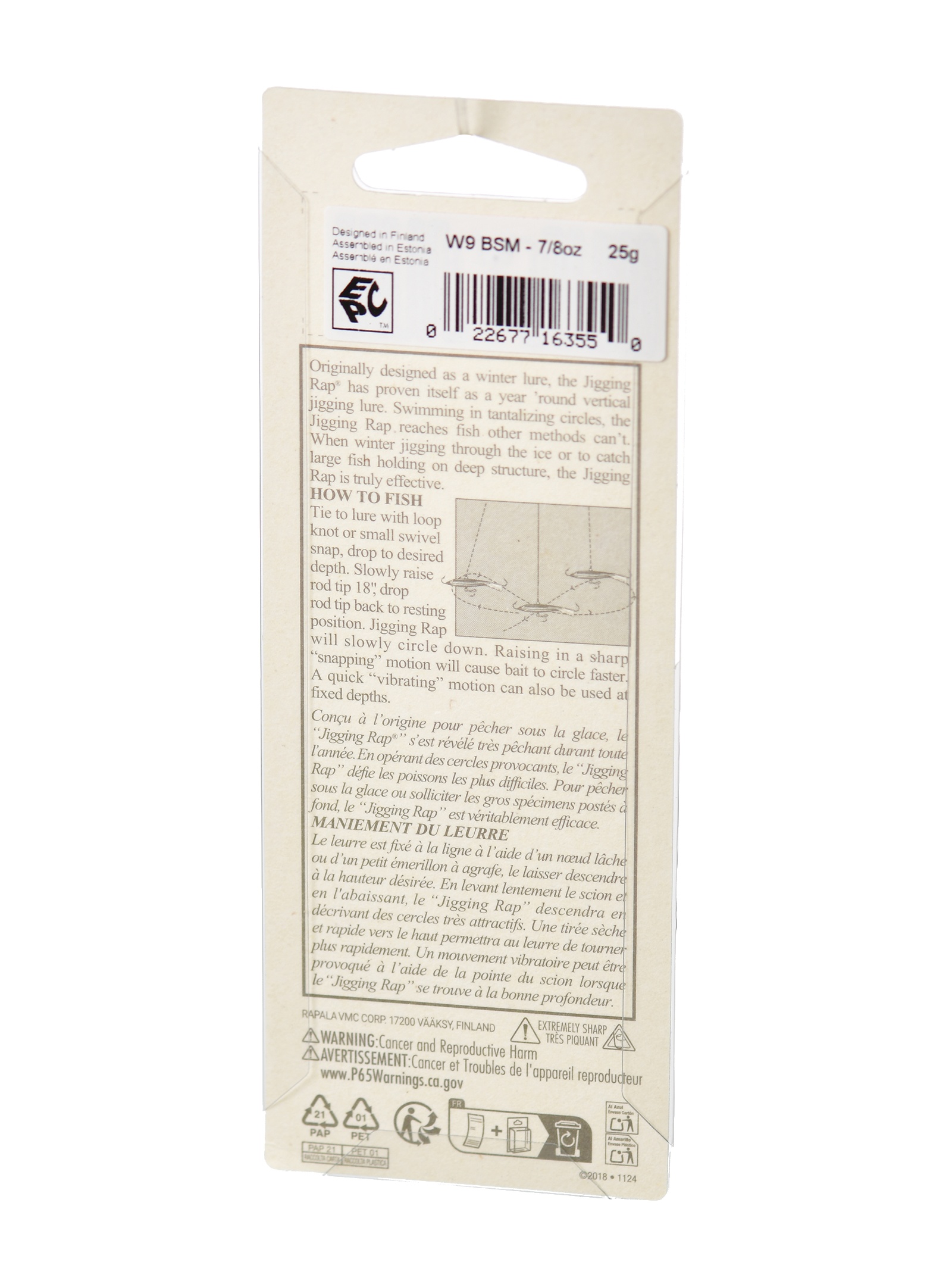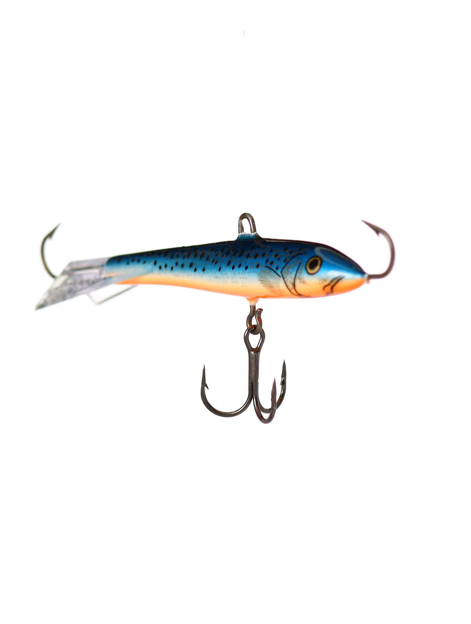 По форме балансир Rapala Jigging Rap напоминает небольшого малька уклейки, плотвички или окунька. Тело приманки вытянуто, немного сплюснуто по бокам. Форма балансира обеспечивает стабильную «восьмерку» и среднюю амплитуду отклонений от оси лунки.