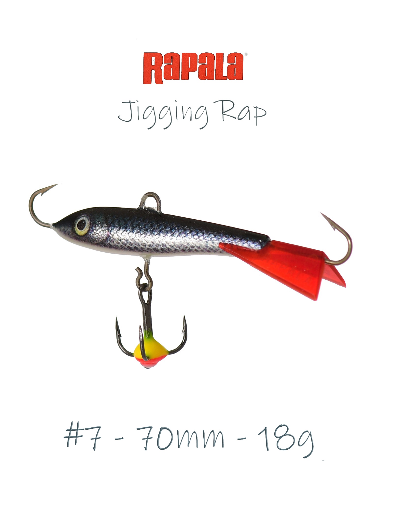 По форме балансир Rapala Jigging Rap напоминает небольшого малька уклейки, плотвички или окунька. Тело приманки вытянуто, немного сплюснуто по бокам. Форма балансира обеспечивает стабильную «восьмерку» и среднюю амплитуду отклонений от оси лунки. Такая классическая игра этого типа зимних приманок одинаково результативна для пассивного, а также активного хищника. Поэтому балансир можно применять, как поисковый, так и точечно, на ограниченных участках акватории ловли.